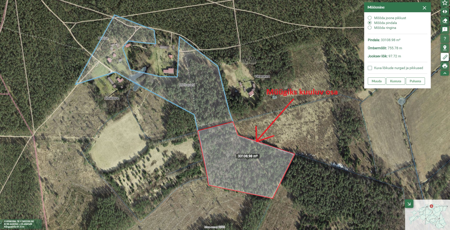 Müügiks kuulub 3,31ha kinnistust, kraavist lõuna-poolne osa, vastavalt jagamise joonisele.