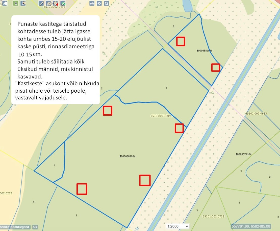 Raietööd peavad toimuma vastavalt oksjoni lisas olevale joonisele. Märgistatud kohtadesse tuleb säilitada igasse alasse 15-20 elujõulist kaske, rinnasdiameetriga 10-15 cm.